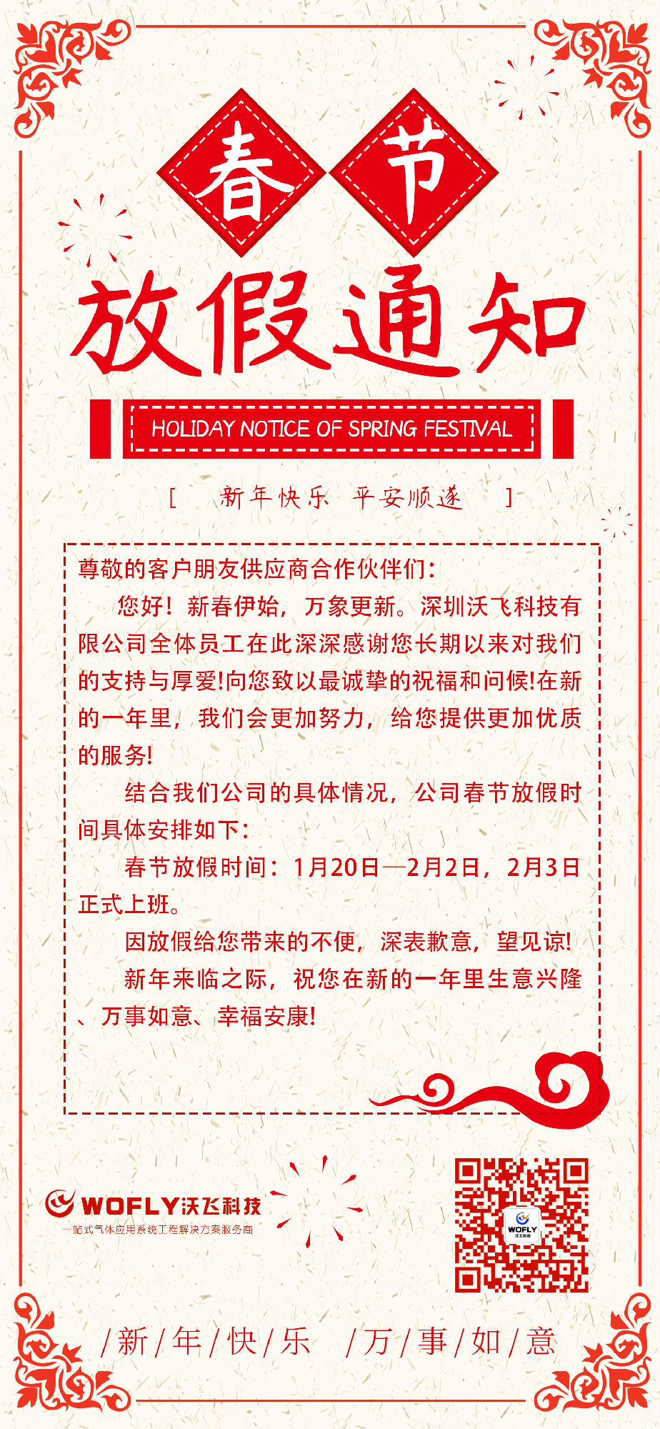 深圳沃飞科技有限公司关于2020年春节放假安排通知