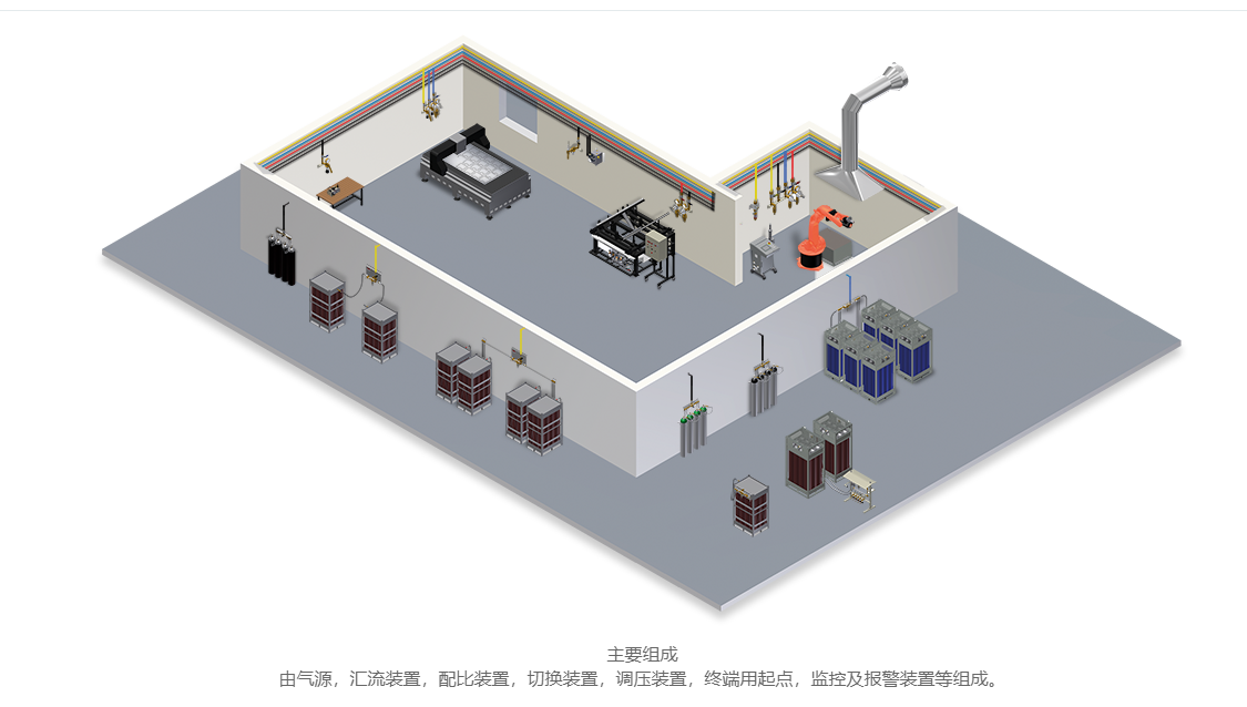 集中供气系统应该领域讲解。集中供气系统(中央供气系统)通过管道将气源输送至分散用气点,具有安全高效、稳定可靠、管理便捷等优势,广泛应用于工业制造、实验室、医疗、商业及特殊行业领域。 以下是其核心优势与典型应用场景的详细说明: