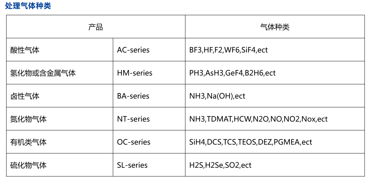 WFS-100F吸附式local scrubber 尾气处理设备可处理气体种类包括半导体、液晶以及太阳能等行业中蚀刻制程与化学气相沉积制程中使用的特气,主要包括SiH4、SiH2Cl2、PH3、B2H6、TEOS、H2、CO、NF3、SF6、C2F6、WF6、NH3、N2O等。