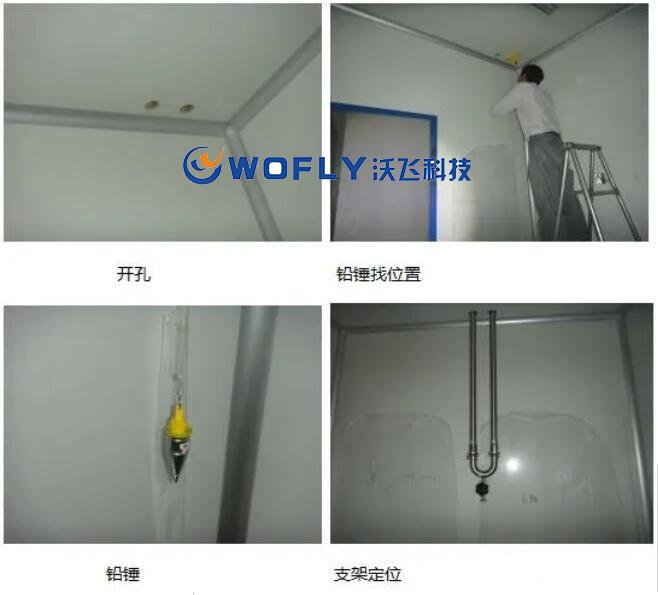 安装时,先在顶棚打出与管道同尺寸的孔洞,将固强套管固定在孔洞上,然后再将做好的支吊架自下而上的穿过顶棚,按照预设的高度,将支架固定在墙面上。